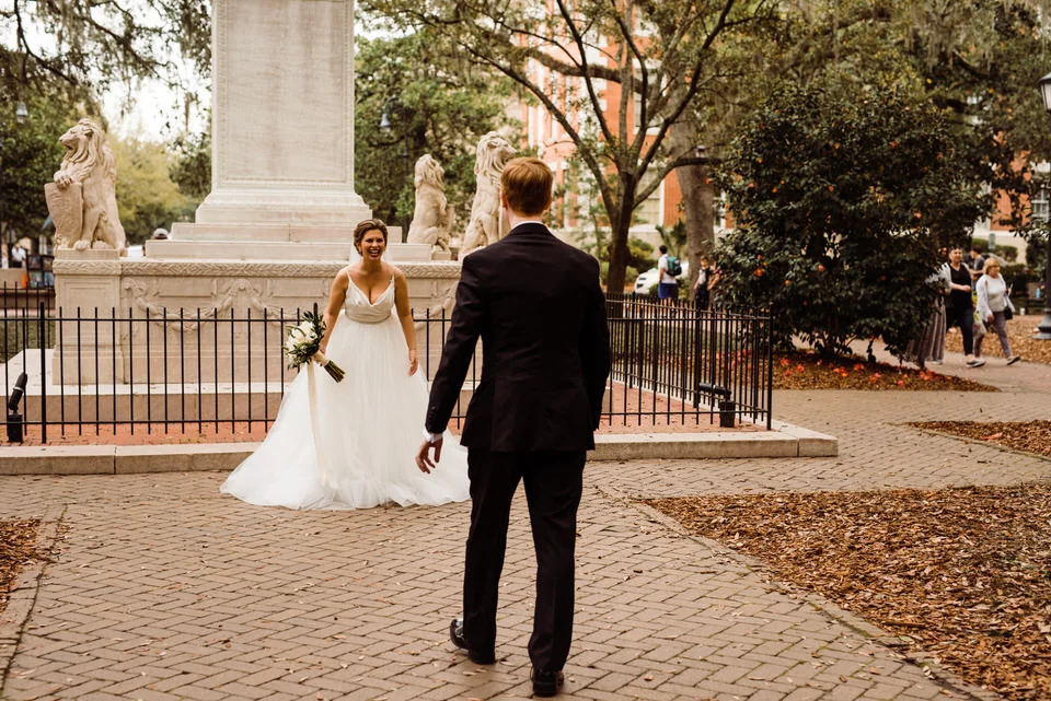Brett + Susan met for a first look in Chippewa Square, in the heart of downtown Savannah. I loved capturing the emotion on Susan’s face when she and Brett looked at each other for the first time on their wedding day! We took some fun portraits at Chippewa and the Savannah Theater and I love how much excitement comes through these!